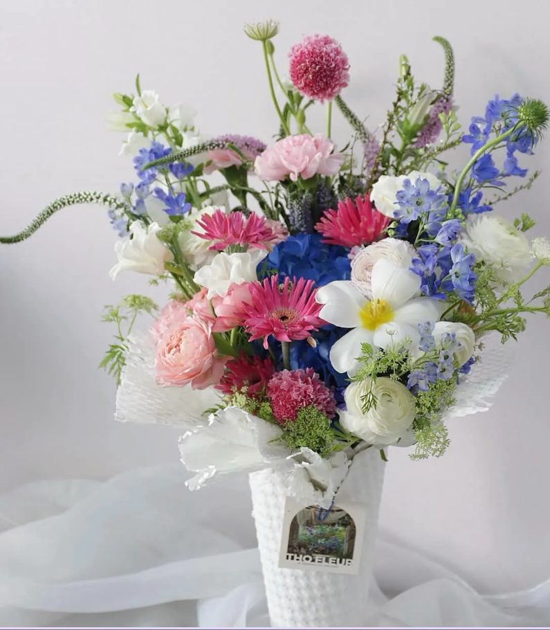 Sự kết hợp của nhiều loại hoa tạo nên một bó hoa tự nhiên, mềm mại và đầy sức sống.