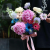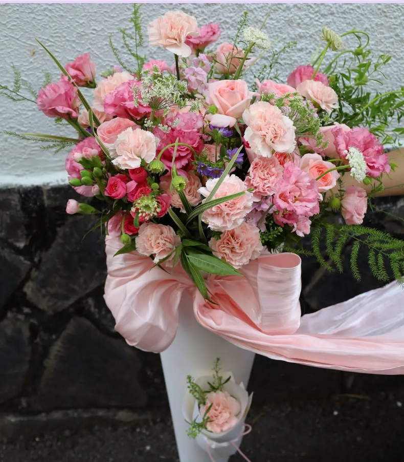 Tông màu hồng pastel tạo cảm giác dịu dàng, nữ tính và ấm áp. Nhìn tổng thể bó hoa rất nhẹ nhàng và lãng mạn.